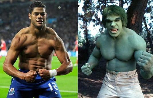 Links de voetballer Hulk. rechts Lou Ferigno als de Hulk